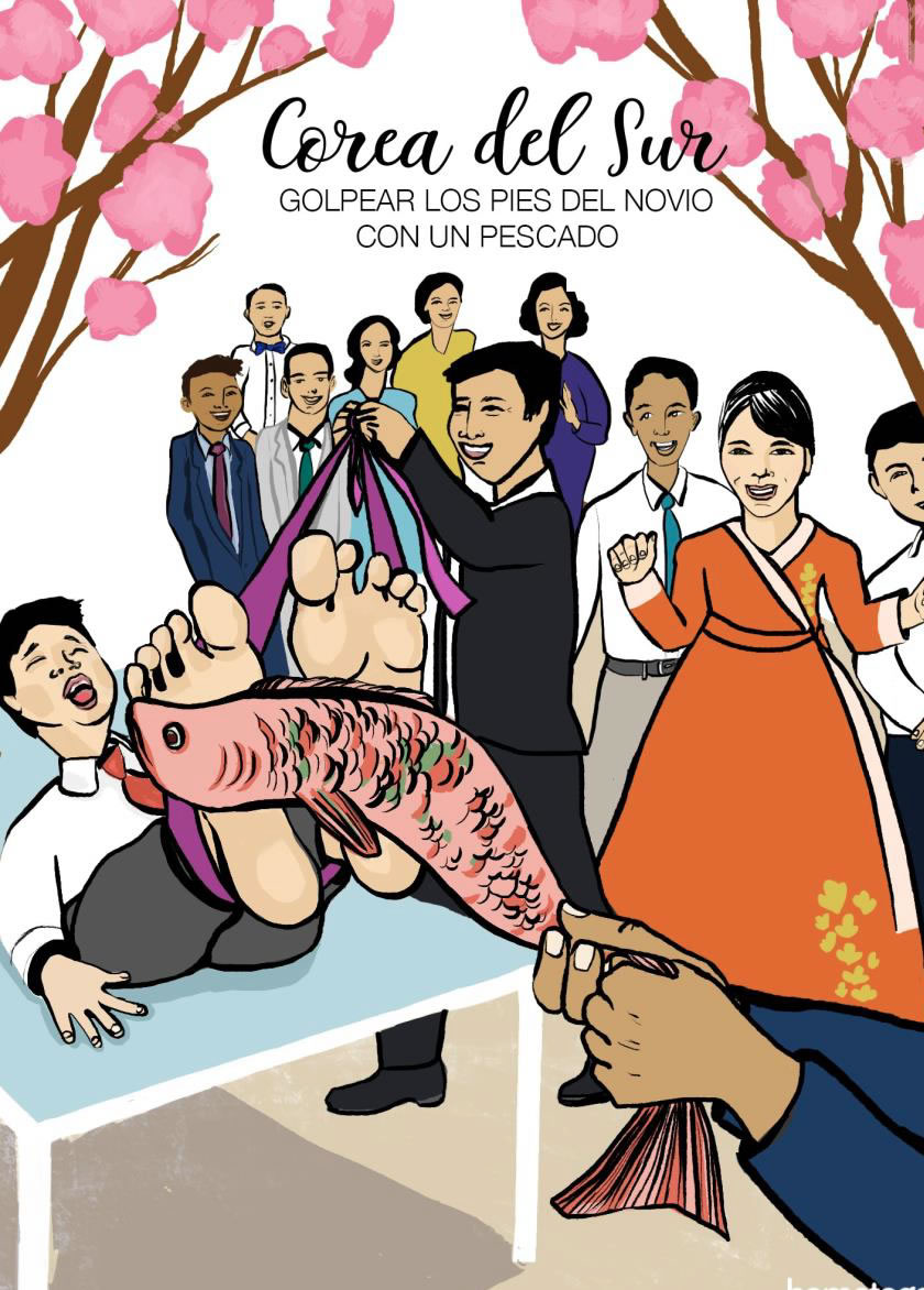 En una boda coreana es muy normal que en medio del banquete los amigos del novio le aten los pies y le golpen la planta del pie como tradicion la cual dice que de esta manera ponen a prueba su fuerza y su carácter
